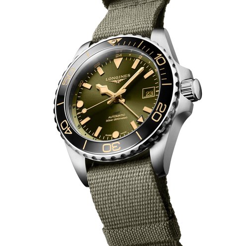 The HYDROCONQUEST watch features a round 41.00mm stainless steel with ceramic bezel case, with a water resistance of 300 meters (1000 feet). This watch is enhanced with a sunray green dial. The functionality of this timepiece is hours, minutes, seconds and date. 24 hours hand with time zone mechanism. It comes with a green synthetic strap with buckle.