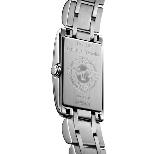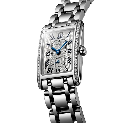 This LONGINES DOLCEVITA watch features a rectangular 20.80 x 32.00mm stainless steel case set with 46 Top Wesselton IF-VVS diamonds, for a total of 0.386 carats and water resistance up to 30 meters (100 feet). This watch is enhanced with a silver "flinqué" dial. The functionality of this timepiece includes hours, minutes, and small seconds at 6 o'clock. It comes with a stainless steel bracelet with triple safety folding clasp and push-piece opening mechanism.