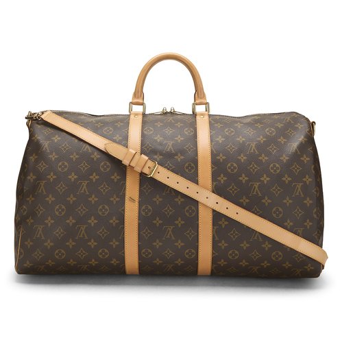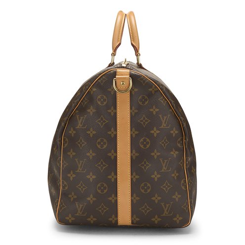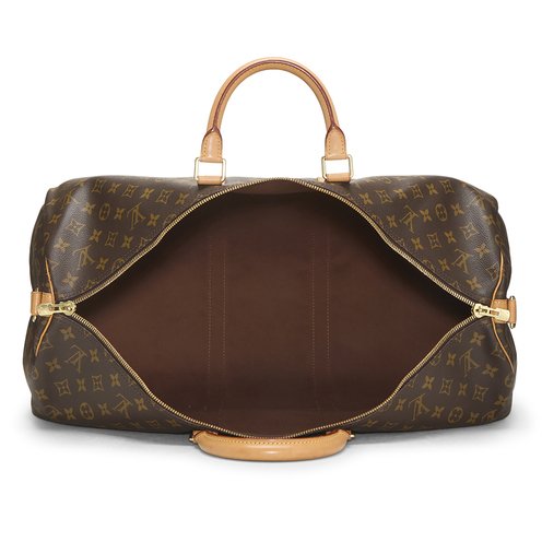The perfect carry-on duffel bag, the Keepall, rendered in Louis Vuitton's classic Monogram coated canvas, with natural Vachetta leather details and accented with gold-tone brass hardware. Features a detachable Vachetta leather shoulder strap for versatile carrying options.
