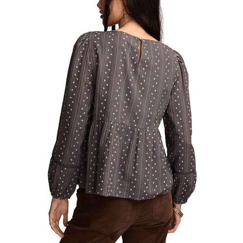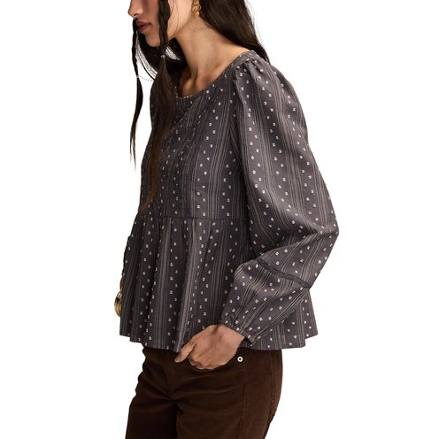 This striped long-sleeve top features pretty floral embroidered details and a flowy peplum hem you love.