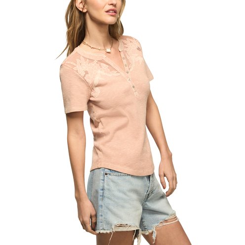 Perfect for any occasion, the Short Sleeve Cutwork Henley from Lucky Brand is a must-have style in your wardrobe. Featuring pretty cutwork details, this Henley looks great paired with jeans, skirts and more.