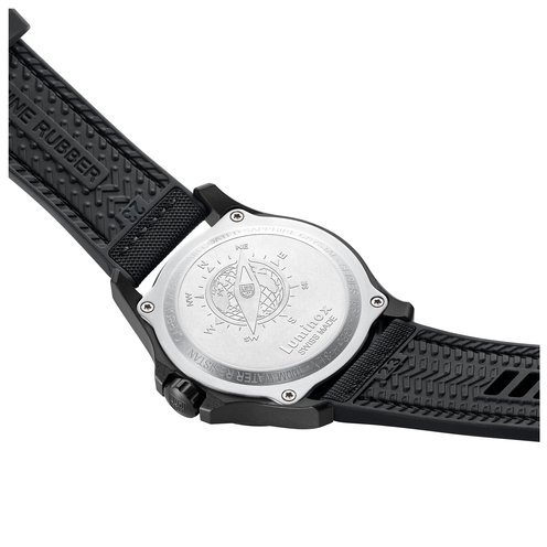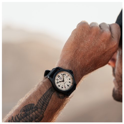 This Atacama Field 1970 watch is inspired by its namesake, the Atacama Desert. The design with a warm grey textured dial and black hour numbers evokes the terrain and rugged landscape of the desert. The timepiece presents a large dial that displays the 12- & 24-hour clock, along with a red tipped second hand and red arrow next to the date at 3 o'clock for instant readability. The dial is protected by sapphire crystal with anti-reflective coating. The 43 mm CARBONOX™ case is matched with a black rubber strap that can also be swapped with the additional second strap that comes with the watch, a green webbing NATO strap.