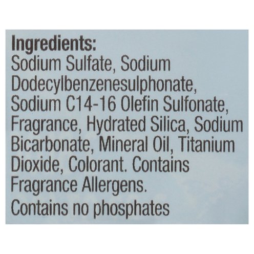 Ingredients: Sodium Sulfate, Sodium Dodecylbenzenesulphonate, Sodium C14-16 0olefin Sulfonate, Fragrance, Hydrated Silica, Sodium Bicarbonate, Mineral Oil, Titanium Dioxide, Colorant.