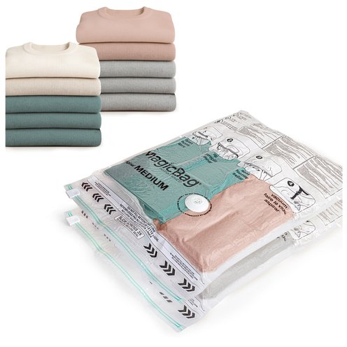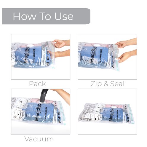 MagicBag Instant Space Storage Bags help reduce clutter by compressing bulky items to save space. These airtight and waterproof bags protect clothing, bedding, and linens from dust, moisture, and odors. Designed for easy use, items are placed inside, sealed, and vacuumed to remove excess air. The durable, reusable design makes them ideal for closets, under-bed storage, and seasonal organization.