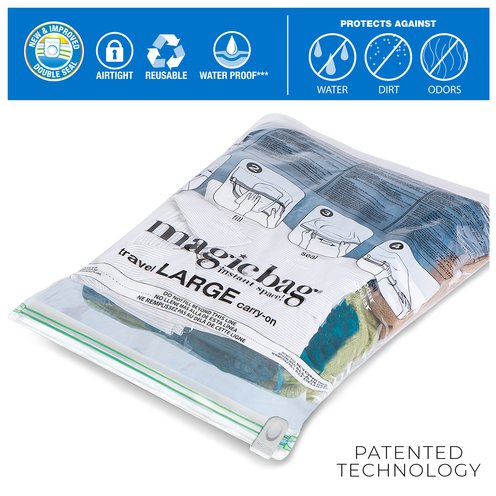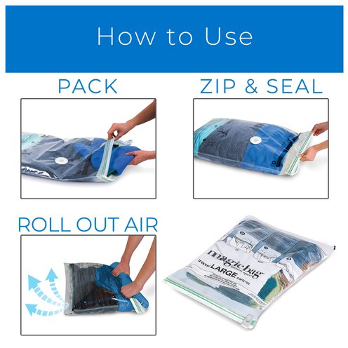 MagicBag Instant Space Storage Bags help reduce clutter by compressing bulky items to save space. These airtight and waterproof bags protect clothing, bedding, and linens from dust, moisture, and odors. Designed for easy use, items are placed inside, sealed, and vacuumed to remove excess air. The durable, reusable design makes them ideal for closets, under-bed storage, and seasonal organization.