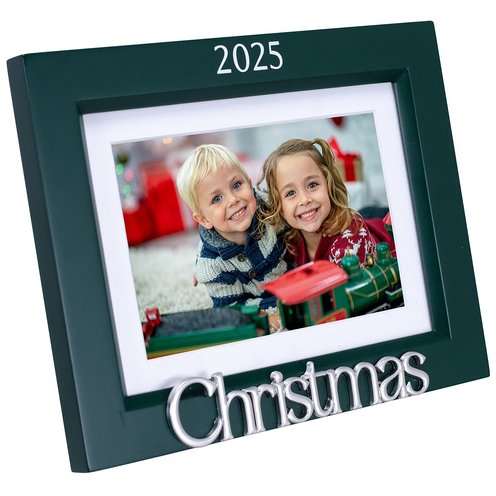 Cherish the moments of your Christmas celebration by displaying them in a beautiful frame that complements your holiday décor. This frame features a festive deep green beveled moulding with a smooth surface and can accommodate a 4" x 6" horizontal photo within a white believed mat. If you prefer, you can also display one 5" x 7" horizontal photo without the mat. The standout feature of this frame is the dimensional word "Christmas" in a matte silver finish, along with the year "2025" silkscreened above the photo in white. You can place this freestanding, easel-backed picture frame on a table or shelf, or mount it on a wall using the attached hardware. Changing photos is simple, thanks to the swing tab closures and the durable glass front will protect and showcase your favorite holiday photo for years to come.