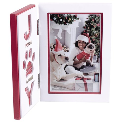 Remember to include your furry friends in your holiday decor with this festive Joy, Peace & Love hinged photo frame. Made from high-quality MDF wood, this unique design features a decorative double-layered panel connected to a photo frame by a pair of silver-finished hinges. The white, satin-finished picture frame holds one vertical 4 x 6-inch photo within a 3.5 x 5.5-inch photo opening. Within the white frame, a vibrant red paper mat adds a pop of color around the photo. A decorative double-layered panel features the word "joy," with a paw print substituting for the letter 'O.' This cut-out design reveals a red plaid layer underneath. The phrase "peace & love" is stamped in metallic gold foil, strategically placed between the cutouts. The lower layer is wider than the top, creating a thin red border accent. This unique hinged design allows the frame to be displayed without the bulk of an easel, making it suitable for various locations around your home or office. The removable frame back has swing tab closures, making it easy to load and change photos. The frame includes a durable glass front to protect and showcase your photo. This piece makes a thoughtful gift for any pet lover during the holiday season.
