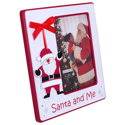 Add a touch of festive charm to your holiday décor with this attractive Santa and Me Photo Frame. The perfect way to display your treasured Christmas photos. This decorative frame holds one 4" x 6" vertical photo and features a charming screenprinted MDF Santa attachment with red ribbon bow and the phrase "Santa and Me" in red text. White and red double layer MDF wood Christmas frame also has silver glitter and foil snowflake detail. This freestanding, easel backed picture frame will display perfectly on a table or shelf. Optionally, use the attached hardware to create a unique wall display. Swap out photos easily with swing tab closures. Picture Frame includes a durable glass front that will protect and showcase your precious photos for years to come.