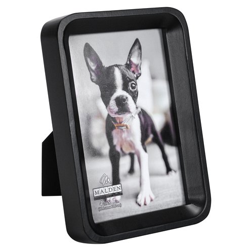 Add a touch of modern style to any space with this beautiful photo frame from Malden International Designs. This decorative curved black wood picture frame is the perfect way to display your treasured photos. This frame is constructed of quality MDF moulding with a wood grain finish. This frame holds a 4x6 inch photo in a 3.5x5x5 inch opening. An easel back allows for horizontal or vertical display on any tabletop or shelf. This picture frame includes hardware on the back, making it easy to hang on a wall. A durable glass front will protect and showcase your precious memories for years to come. It is simple to load with quality swing tab closures on a removable back panel.
