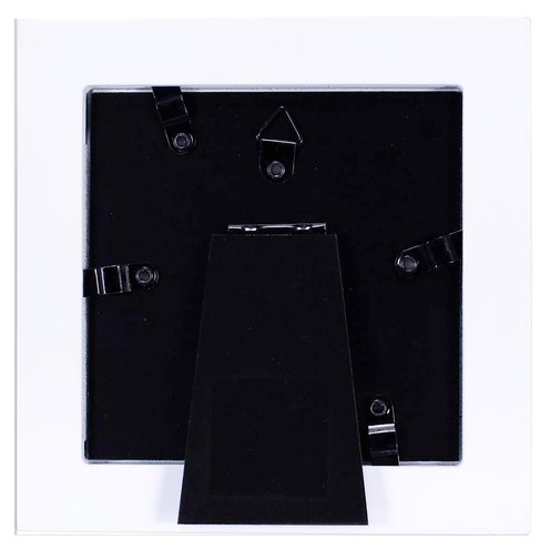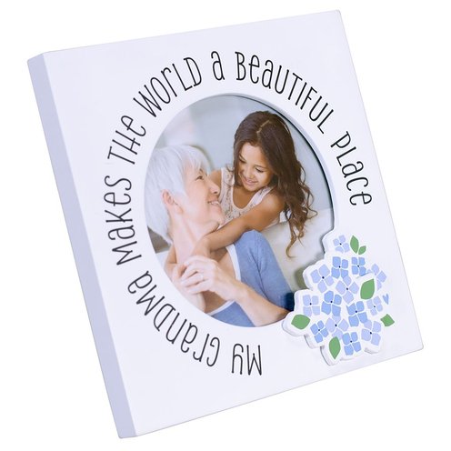 Celebrate Grandma this Mother's Day by giving her a charming picture frame. This sweet design features a square, matte-white frame with an attachment and a heartfelt sentiment. The phrase "My grandma makes the world a beautiful place" is silkscreened in charcoal gray around the photo opening. Additionally, an attached illustration of stylized blue hydrangeas adds a pop of color and interest. It's a simple yet impactful design that suits a variety of decor styles. This frame holds one 4" x 4" photo within a round 3.5" x 3.5" display opening. It is freestanding with an easel back, allowing it to be displayed on any flat surface. Alternatively, you can use the attached hardware to create a unique wall display. Swing tab closures make it easy to load photos, and a durable glass insert protects and showcases your favorite photograph.