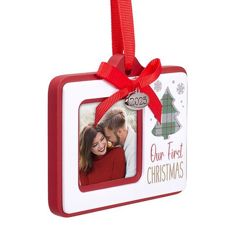 Add a touch of style to your Christmas décor with this attractive Photo ornament. This white and red, double layer MDF wood Christmas ornament is the perfect way to display your treasured photos. This decorative ornament holds one 2.5" x 2.5" photo within a 2" x 2" display openign and features a cut out Christmas tree opening with festive green plaid background, red ribbon bow attachment with silver finishmetal "2025" charm and the phrase "Our FIrst Christmas" in gold foil and red text. Silver foil snowflake detail. The ornament comes with a red ribbon hanger. Change photos easily with swing tab closures. Durable glass front will protect and showcase your holiday photos for years to come.