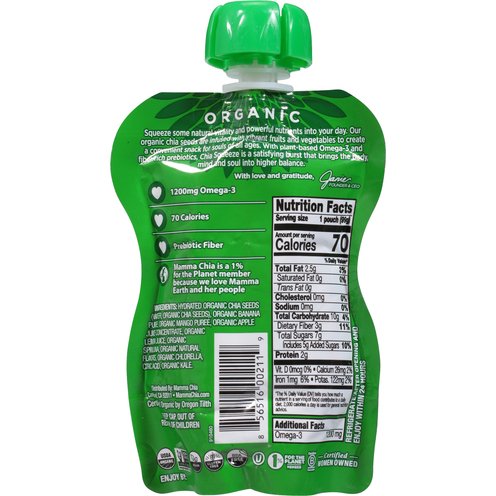 Per Serving: 1200 omega-3; 70 calories. USDA Organic. Certified Organic by Oregon Tilth. Vegan & gluten free. Prebiotic fiber. Non-GMO Project verified. Seed your soul. Squeeze some natural vitality and powerful nutrients into your day! Our organic chia seeds are infused with vibrant fruits and vegetables to create convenient snack for souls of all ages. With plant-based omega-3 and fiber rich prebiotics, Chia Squeeze is a satisfying burst that brings the body, mind and soul into higher balance. With love and gratitude, -Janie, Founder & CEO. Certified B Corporation. Certified Women Owned. BPA free. Mamma Chia is a 1% for the Planet member because we love Mamma Earth and her people.