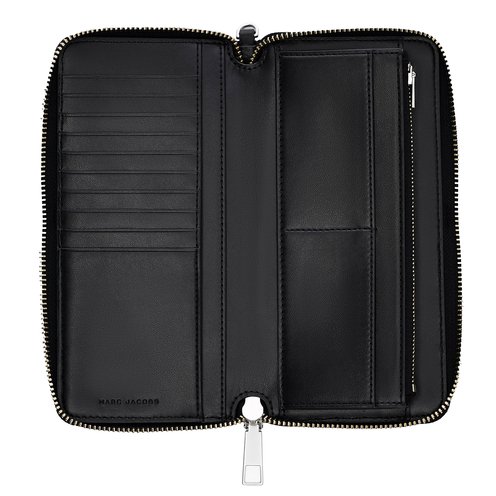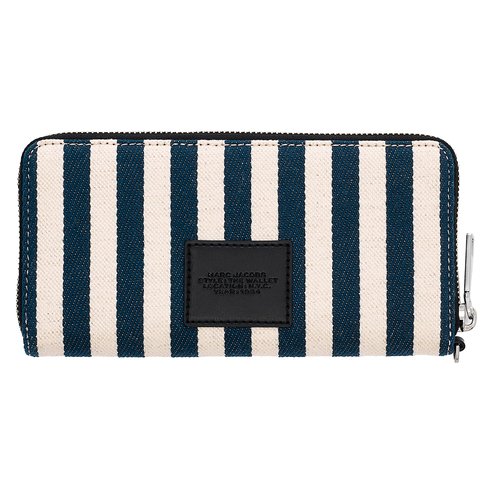 This blue and ivory striped wallet is made from a heavyweight cotton-linen blend with a textural-feel. It features a top zip closure and removable wristlet strap for effortless styling. Inside, there's twelve interior card slots, one interior bill sleeve, one zip-closure coin pocket, and two interior slip pockets.
