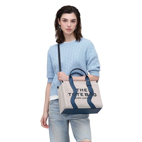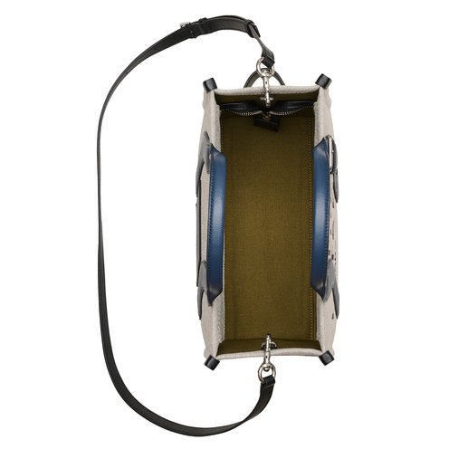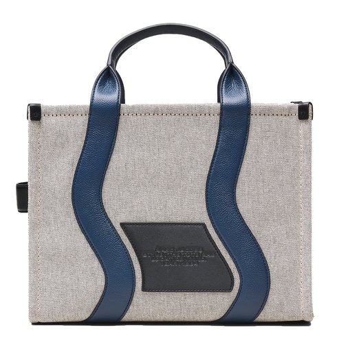 A funky take on our classic canvas tote with a fun, wavy detail. A logo patch on the back mimics the wave of the suspenders. This bag features a contrasting color trim in smooth and pebble leather and an oversized buckle detail on the top handle. A chunky top zip closure, one slip pocket, one card slot, and the namesake branding. Carry yours by the top handles or attach the adjustable, removable crossbody strap for hands-free styling. A leather base reinforces the shape and protects contents.