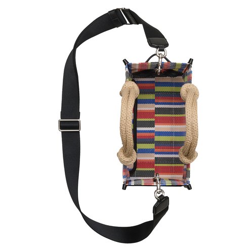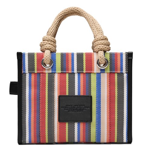 Utilitarian, yet elevated. This bag makes the every day feel extraordinary. This iconic tote is inspired by Marc archives and is for so much more than errands. Made from striped rainbow mesh material with leather trim and detailing. Knotted rope top handles make for easy carrying. A top zip closure keeps everything safe. Inside, an internal slip pocket for additional storage.