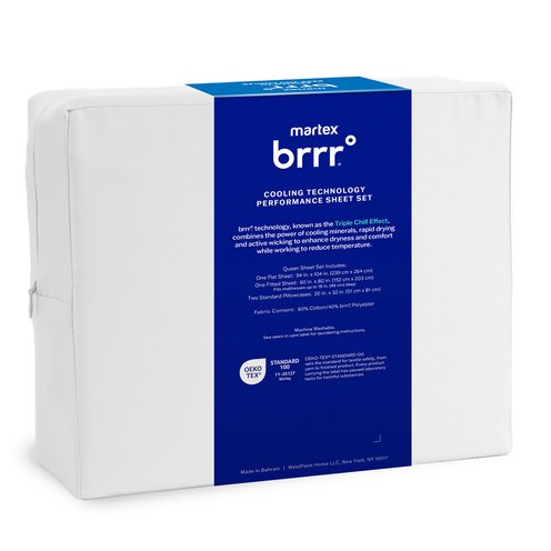 Stay cool with the Martex x brrr° Cooling Technology Sheet Set. Sleep hot? Its cooling technology-the Triple Chill Effect™ - is scientifically proven to keep you cool while you sleep. It embeds the fabric with cooling minerals that help provide an immediate and continuous cooling effect while it wicks away moisture and dries quickly. They're soft, stylish, and designed to help you stay fresh and chill all night long.