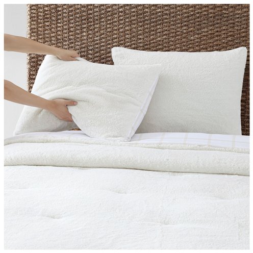 SLEEP LUXURIOUSLY THIS SEASON with this reversible comforter set. Crafted of plush faux rabbit fur and ultra soft microfiber, the comforter and shams have a sumptuous hand feel and offer cozy warmth for chilly nights. A hypoallergenic 100% polyester fill makes this a great set for layering. Pair this comforter set with sheets, pillows, and other designs by Martha Stewart.