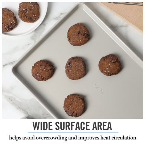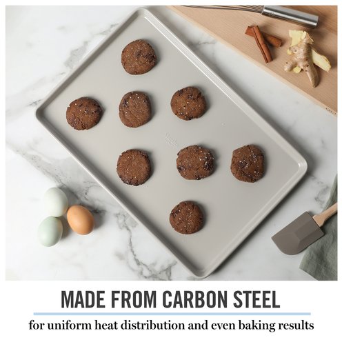 Martha Stewart Gallen Nonstick 17-inch carbon steel cookie sheet. Martha Stewart's Gallen Bakeware collection gears up home bakers for frequent family visits, five-star rave reviews and ultimately, multiple rounds of baking success. A selection of bakeware essentials, this collection features the core classics to bake, brown, roast and serve go-to suppers and signature desserts. Made from durable carbon steel, it responds to heat quickly to conduct and distribute it for even results. The rolled edges protect the bakeware from warping to maintain its original shape after multiple baking sessions and frequent exposure to high heat. Hand wash only.