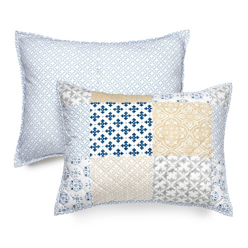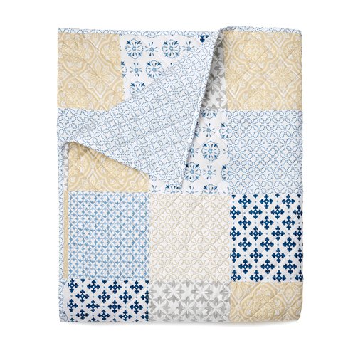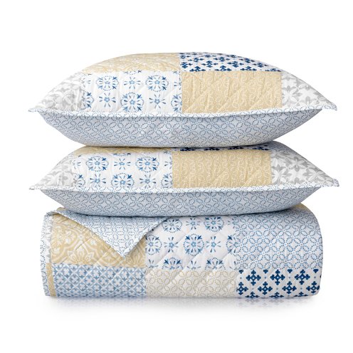 BEAUTIFUL STYLE & ELEVATED DESIGN for your home with this reversible quilt set by Martha Stewart. This soft multi-color patchwork print is a charming geometric tile reversing to an all-over blue and white pattern for two looks in one. Inspired by the French Rivera featuring soft gray, sunny yellow, and blues will set the scene. Both quilt and shams feature diamond stitching and bound edges for a tailored look. The pillow shams include an easy-to-use center overlap, opening to secure pillow.