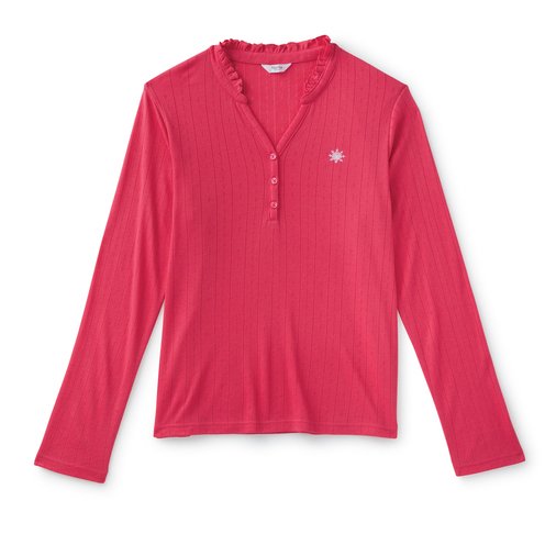 Beautiful flutter collar henley PJ top in brushed back pointelle with comfy brushed flannel pants.