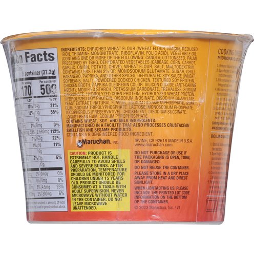 - Contains wheat, soy, and milk ingredients. Manufactured in a facility that also processes crustacean shellfish and sesame.,Caution: Product is extremely hot. Handle carefully to avoid spills and severe burns. After preparation, temperature should be monitored for children under 15 years old. Product should be consumed at a table with adult supervision. Never microwave without water in the container. Do not leave microwave unattended. Do not purchase or use if the packaging is open, torn, or damaged. Do not reuse the container.