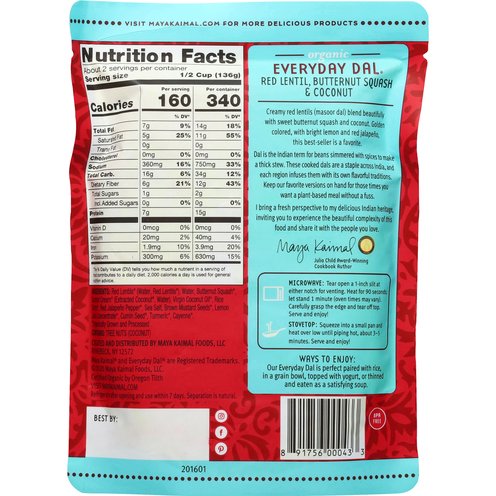 USDA Organic. Certified Organic by Oregon Tilth. Vegan. Plant-based protein. Ready in 90 seconds. Separation is natural. Creamy red lentils (masoor dal) blend beautifully with sweet butternut squash and coconut. Golden colored, with bright lemon and red jalapeno, this best-seller is a favorite. Dal is the Indian term for beans simmered with spices to make a thick stew. These cooked dals are a staple across India, and each region infuses them with its own flavorful traditions. Keep our favorite versions on hand for those times you want a plant-based meal without a fuss. I bring a fresh perspective to my delicious Indian heritage, inviting you to experience the beautiful complexity of this food and share it with the people you love.- Maya Kaimal, Julia Child Award-Winning Cookbook Author.