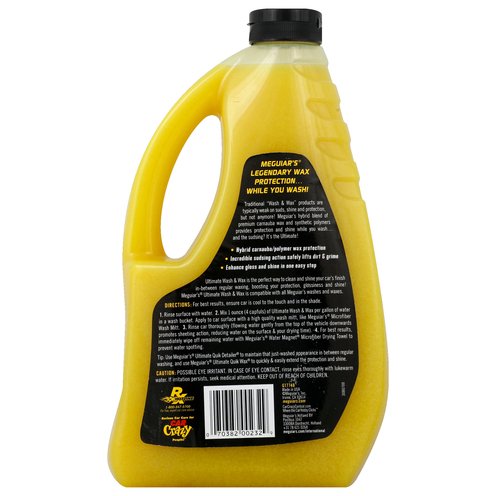 Meguiar's® Ultimate Wash and Wax is the perfect way to not only clean, but also boost your protection, glossiness and add shine to your car's finish in-between regular waxing, . Traditional "Wash and Wax" products are typically weak on suds, shine and protection, but not anymore! Meguiar's hybrid blend of premium carnauba wax and synthetic polymers are compatible with all Meguiar's waxes, and provide protection and shine with superior sudsing, all while you wash!