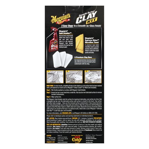 Make your wax protection last longer by removing bonded surface contaminants and restoring a smooth-as-glass finish with Meguiar's Smooth Surface Clay Kit. Our non-abrasive clay bar safely, easily and quickly removes paint overspray, fallout, environmental contaminants and more, making your car easier to wax and the protection longer-lasting. The kit comes complete with three 60 gram premium clay bars, a 16 oz spray bottle of Quik Detailer Mist & Wipe, and one Supreme Shine Microfiber Towel. This kit comes with everything you need to safely remove above surface bonded contaminants, make your paint smooth and prepare the surface to make sure your wax protection last as long as possible.