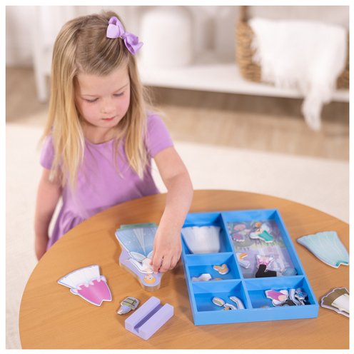 Mix and match 30 clothing and accessory pieces to tell the tale of Disney Princess Cinderella – or create your own fashion story! The wooden magnetic Cinderella doll fits into a wooden stand for pretend play. With sturdy wooden pieces in coordinating designs, there are countless combinations to create and tales to tell. The doll, stand, and pieces all store in a sturdy wooden tray. This unique dress-up doll helps kids three and older develop hand-eye coordination and fine motor, counting, and sorting skills, and encourages creative expression and imaginative play.