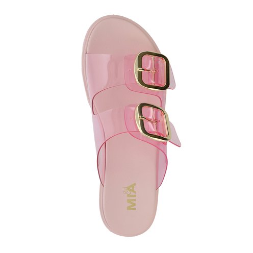 Your slide collection just got better with our best-selling sandal NATESI. This dual-buckle strapped sandal is perfect for the season. Featuring our MIA Signature Footbed® and a 1.4-inch platform heel, she's your go to this summer. Now available in a jelly upper with chic gold buckles.
