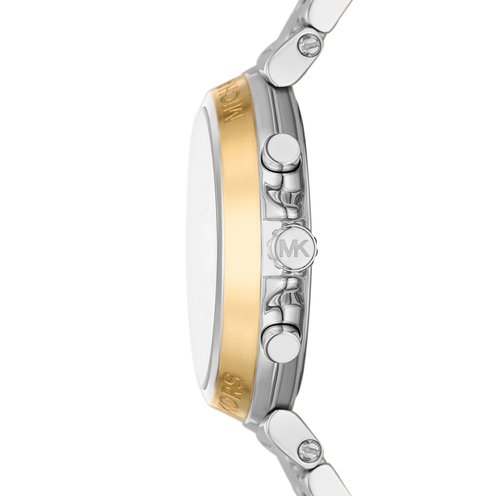 Michael Kors' 40mm Maren watch features a white sunray dial, chronograph movement and stainless steel bracelet.