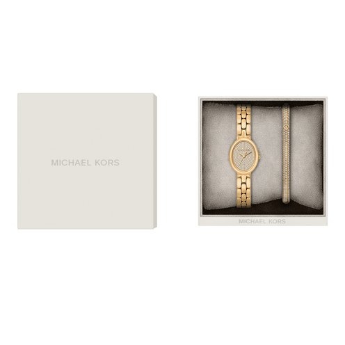 Give the gift of chic with this two-piece set. Our sleek oval Maude watch, designed with a three-link pill bracelet and pav� dial, is paired with a matching pav� bangle in rose gold-tone. Together, they deliver a polished finish with plenty of sparkle, all presented in a signature box that makes for the perfect present.
