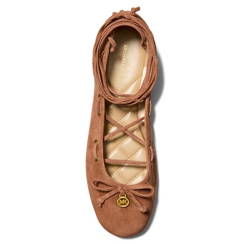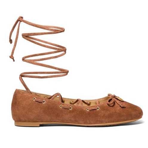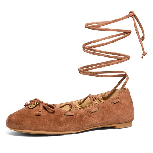 Reminiscent of classic dancer styles, the Shae ballet flat is poised to be one of the season’s standout designs. Long lace straps wrap elegantly around the ankle, while a charm-accented bow adds a refined finishing touch. This suede version is truly versatile—elevating denim and dresses alike.