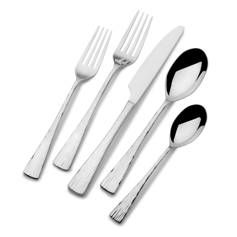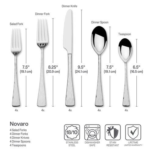 Break from tradition when you update your tabletop display with this Novaro 20-Piece Flatware Set by Mikasa. Beautifully crafted of 18/10 stainless steel to stand up to the rigors of everyday use, this boldly contemporary flatware is notably subtle in its presentation, with narrow necks that gently angle outward into squared off tips. The striated line design brings to mind an organic woodgrain pattern, and the unique, delicate shapes of the utensil heads add to the distinctly modern appeal. 20-piece set, service for 4, includes 4 each of: dinner fork, salad fork, dinner knife, dinner spoon, and teaspoons. Dishwasher safe.