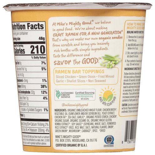 Certified Organic by QAI. Craft ramen. Insanely rich broth. At Mike's Mighty Good, we believe in good food. We�re about making craft ramen for a new generation. That�s why we make our own organic noodles from scratch and bring you insanely rich broths with simple ingredients. Taste the difference and savor the good. Sustainable Forestry Initiative: Certified sourcing. Made with solar power.