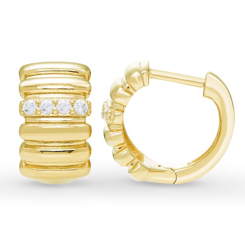 Petite yet different, these lab-created diamond ribbed huggie hoop earrings are all about the details. Finished in sterling silver with yellow gold plating, these hoops are set with 1/6 carat of lab-created diamond and with hinge post-snap closure.