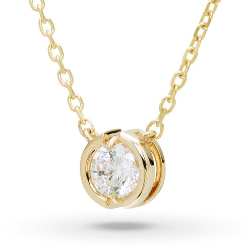 Always just the right look, this classic diamond necklace is the start of something beautiful. Crafted in sterling silver with yellow gold plating, this petite style showcases a sparkling 1/4 ctw lab-grown diamond solitaire - in a sleek partial-bezel setting. Buffed to a brilliant luster, this dainty design sits centered along an 18.0-inch cable chain that secures with a lobster claw clasp.