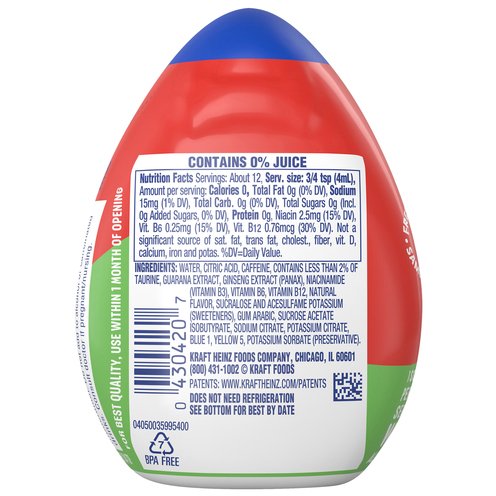 Natural flavor with other natural flavor. 0 calories per 3/4 tsp. Caffeine & B vitamins. 90 mg caffeine per 3/4 tsp. Fresh look. Same flavor. BPA free.