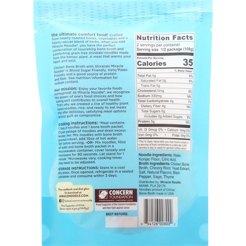 35 calories per serving. 5 g protein per serving. Keto & paleo. Chicken bone broth with shirataki Miracle Noodle is blood sugar friendly, keto/paleo friendly and a good source of protein and fiber. See nutrition information for sodium content. Plant based noodles. Powered by Lono Life bone broth. Ready in minutes. The ultimate comfort food! Crafted from hearty roasted bones, vegetables and a family-secret blend of herbs, when you add Miracle Noodle, you have the perfect combination of nourishing bone broth and comforting grain free shirataki noodles made from the konjac plant. A meal that warms your heart and soul. Our Mission: Enjoy your favorite foods reimagined! At Miracle noodle, we recognize the power of one's food choices and how eating well contributes to overall health. That's why we created a line of healthy plant based noodles, rice, and ready to eat meals that offer delicious, satisfying meal options without guilt or compromise. Noodles product of China/ bone broth made in USA.