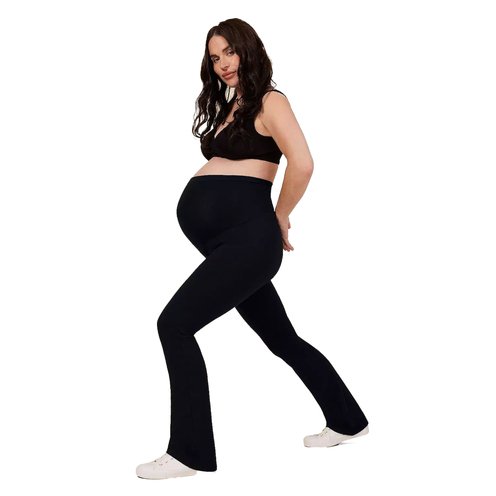 Enjoy the classic look and soft feel of these Maternity Motherhood® Full Length Flare Leggings, featuring a belly band that can go over the bump of fold just below, offering a perfectly comfortable fit.