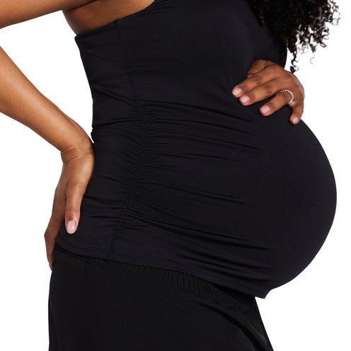 This basic sleeveless maternity tank top is a wardrobe must-have. Perfect for layering, this scoop neck tank is available in a variety of colors with just the right amount of length and stretch. Side ruching grows with the bump, so you can rock this look for every trimester, and then some!