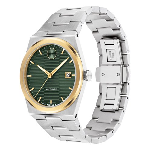 The BOLD Quest Automatic looks to the future with a shaped case and an integrated bracelet. A Swiss made self-winding movement drives this watch, powered by the motion of your wrist. This 39mm watch features a green dual texture dial, yellow gold-tone hands, an exhibition case back, and our signature dot at 12 o'clock.