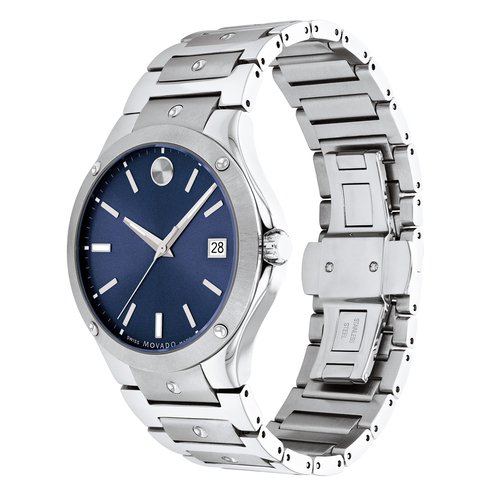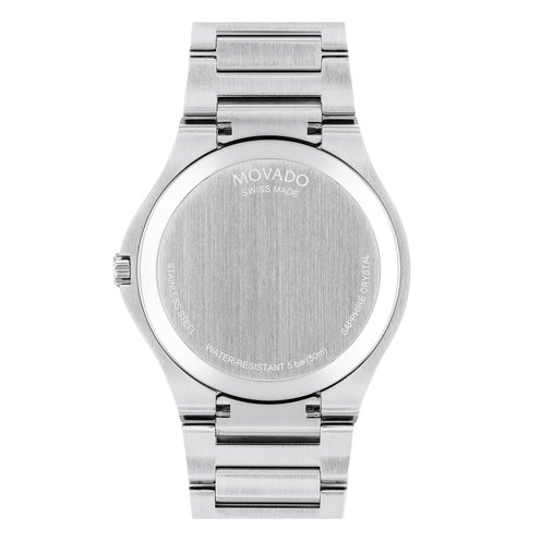 Movado SE, 41mm dual finished stainless steel case and bracelet with concave polished dot accents and sunray dial. Features Sapphire crystal, date window detailing, and Swiss Super-LumiNova® hands, hour markers & indices at 6:00 and 9:00.
