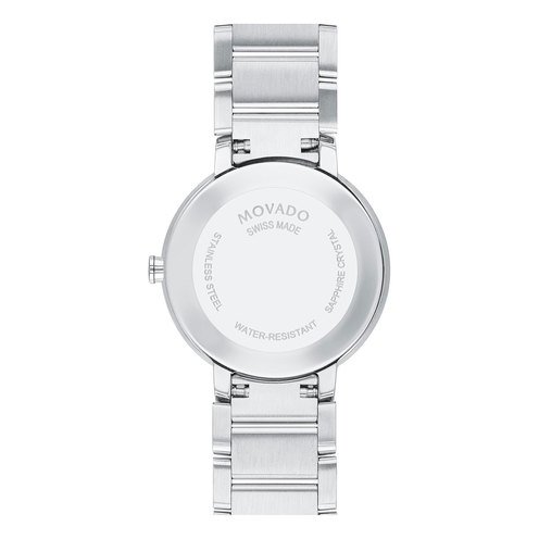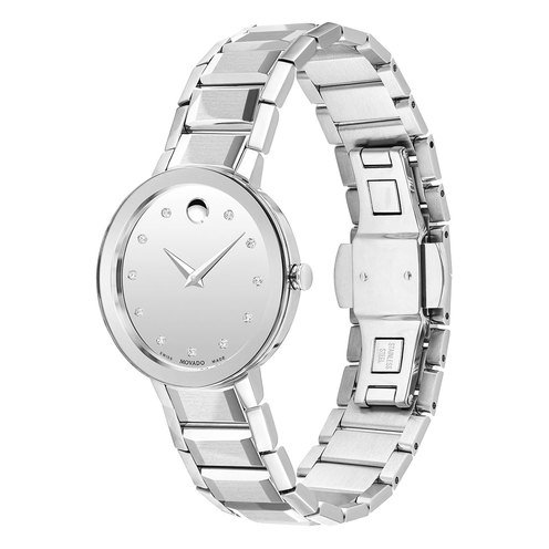 Movado Sapphire, 28 mm stainless steel bezel-free case with flat edge-to-edge sapphire crystal. Features a stainless steel bracelet with a silver mirror dial and 11 diamond markers.