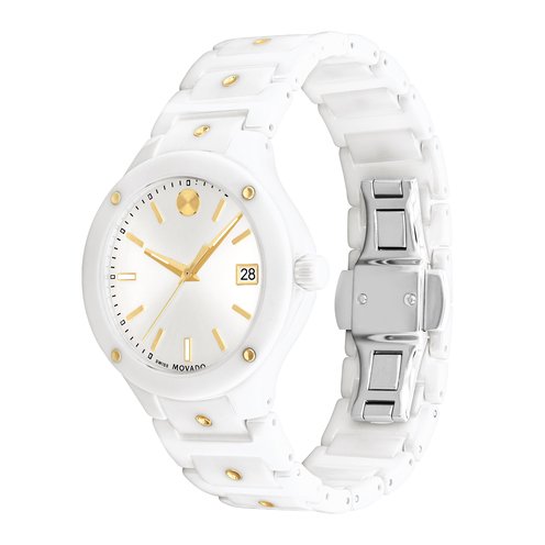 Iconic design meets elevated sporty style. We've added a signature touch to this two-tone design with our iconic dot motif displayed in gleaming yellow gold PVD at 12 o'clock and at the concave accents. A true modern classic, this watch is crafted from ultra-contemporary ceramic and features a classic 32mm case and a sunray dial fitted with sapphire crystal, a date window, and Swiss Super-LumiNova® hands, hour markers, and indices at 6:00 and 9:00.