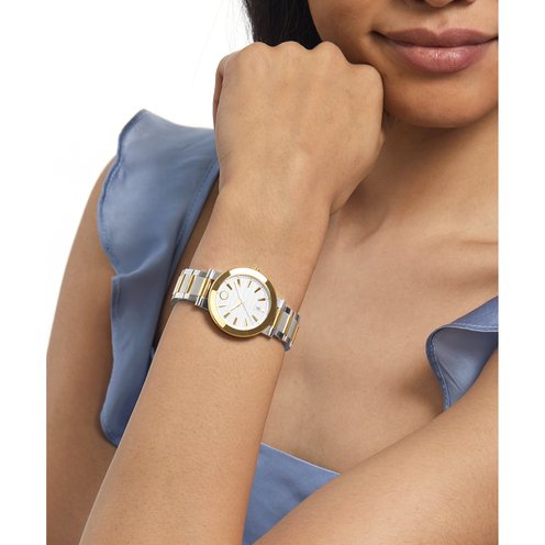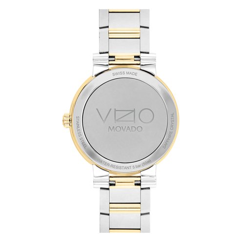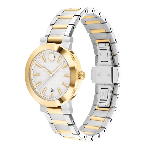 Striking modern design with a strong, sophisticated aesthetic. This timepiece is crafted from durable stainless steel and gleaming yellow gold PVD. A bezel of Dura904, an innovative steel prized for its nearly indestructible nature, comfort on the skin, and ability to hold a beautiful polish, frames its 32mm case which houses a textured white dial finished with a date window and Swiss Super-LumiNova® hands, hour markers, and indices. The signature Vizio bullet-lug bracelet completes the design.