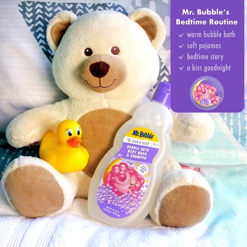 Mr. Bubble Calm & Sleep 3-in-1 bubble bath, body wash and shampoo makes the nighttime bath routine fun and easy for toddlers and young children. After a day of messy fun, the calming scent of lavender, eucalyptus and chamomile will help your little one get ready for dreamland while a nourishing blend of aloe and shea butter leaves their skin feeling soft & refreshed.