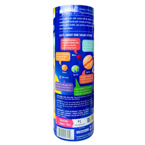 Come explore our solar system with Mr. Bubble’s Galaxy Bath Bombs! This exciting, colorful bath bomb set includes all 8 planets, offering a fun and educational experience for kids. As each planet bubbles, spins, and fizzes in the tub, children can learn cool facts about the planets, making bath time both enjoyable and informative. Each bath bomb planet features Mr. Bubble’s signature Bubblegum scent. Use them one at a time or combine planets to make colorful, vibrant, swirling creations in the water. Mr. Bubble Galaxy Bath Bombs encourage STEAM learning and play (science, technology, engineering, arts, and math).