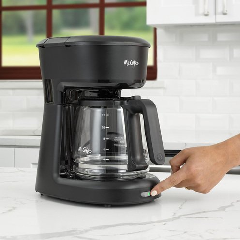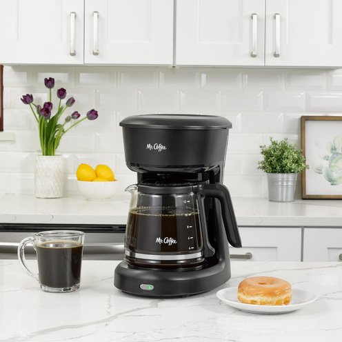 Enjoy great coffee simply made with this Mr. Coffee® 12-Cup Coffee Maker; just turn it on, brew, and enjoy. The Grab-a-Cup Auto Pause feature stops the brewing cycle so you can pour a cup, and then continues brewing until complete. The easy switch with power indicator lights up to show the coffee maker is on, or to remind you to shut it off. This easy coffee maker is simple to clean and care for, and includes a Mr. Coffee water filtration system to help remove chlorine and improve coffee taste.