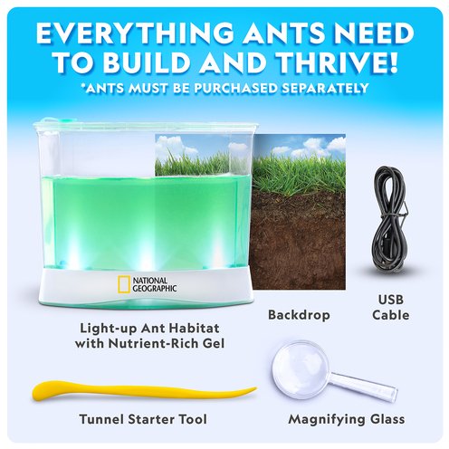 Watch ants in action with the National Geographic Deluxe Light-Up Ant Habitat! Kids will love watching as ants (not included) dig tunnels in the nutrient-rich green gel provided in this habitat kit! The habitat is specially designed with 3 LED lights that make it even easier to see what the ants are up to and includes two magnifying glasses built into the top cover, allowing kids to see the ants up close! A fascinating learning guide contains tons of facts about ants and ant colonies in the wild. This kit also includes a backdrop for the habitat which allows kids to create a scene worthy of display! Get the Deluxe Light-Up Ant Habitat today! Comes with one USB cord to power the light.